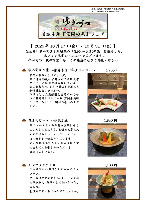 ゆうづつでは、令和7年10月17日(金)10月31日(金)まで、『笠間の栗メニューフェア』に参加いたします。